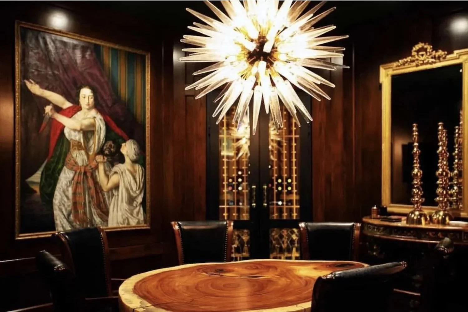 Custom single-slab live edge burl poker table with sculptural base, handcrafted in San Diego. Shown installed in an elegant, dark-toned private game room featuring a massive starburst chandelier and classic furnishings.